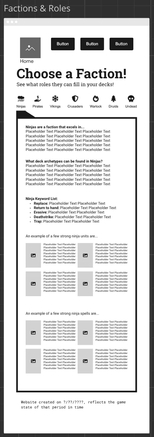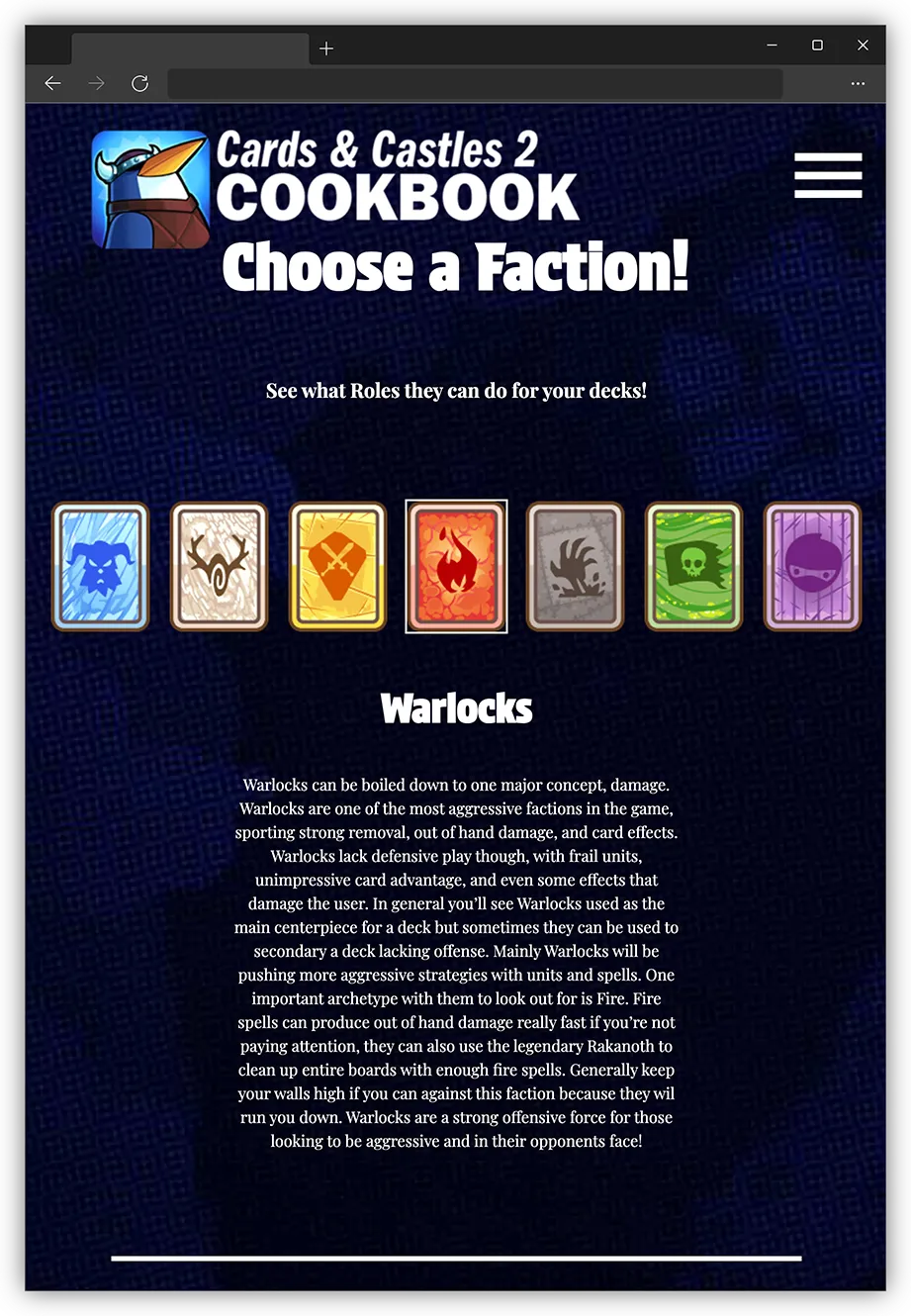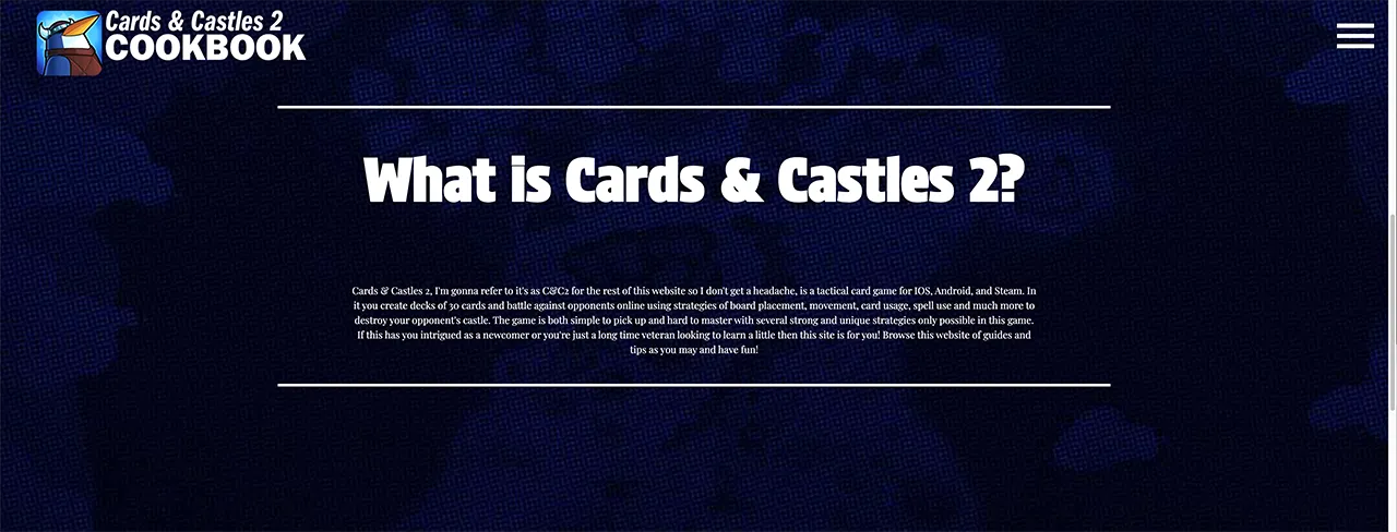 This website was designed as a strategy guide for new players looking to get into my favorite mobile card game, Cards & Castles 2. It runs through tips for 3 very integral aspects of the game, building decks, choosing your factions, and playing actual matches against other opponents. I intend to have players be able to enter with a beginner level of understanding of the game and be able to leave with a clear path forward on how to compete in the game.